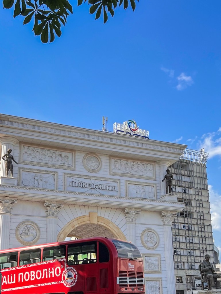 A diadalív, hivatalos nevén Porta Macedonia, Szkopje szívében található, és a modern Észak-Macedónia identitását szimbolizálja. Az építményt 2012-ben avatták fel, a „Skopje 2014” városfejlesztési projekt részeként, amelynek célja az volt, hogy a főváros egy új, büszkébb és grandiózusabb arculatot kapjon. A diadalív formája Párizs híres Arc de Triomphe-jára emlékeztet, miközben domborművei a macedón történelem fontos eseményeit és alakjait ábrázolják. A szobrok és különféle építészeti stílusok sokszínűsége mellett pedig a piros emeletes buszok is ikonikus látványossággá váltak, amelyek London hangulatát idézik.