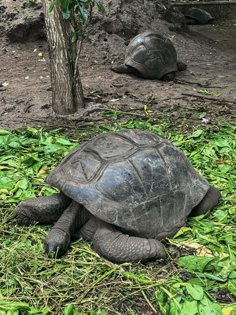 Az ültetvény legnagyobb látványossága kétségtelenül a Seychelle-i óriásteknősök. Ezek a lassú, békés óriások lenyűgöző élőlények, amelyek akár 200 évig is élhetnek. Csendesen sétáltak vagy éppen a napfényben sütkéreztek. Amikor odaléptem egy nagyobb teknőshöz, az kíváncsian felemelte a fejét, mintha csak üdvözölni akart volna. Az etetés során friss zöldségeket, leginkább salátát és leveleket kaptak, amiket a kezemből is szívesen elfogadtak.