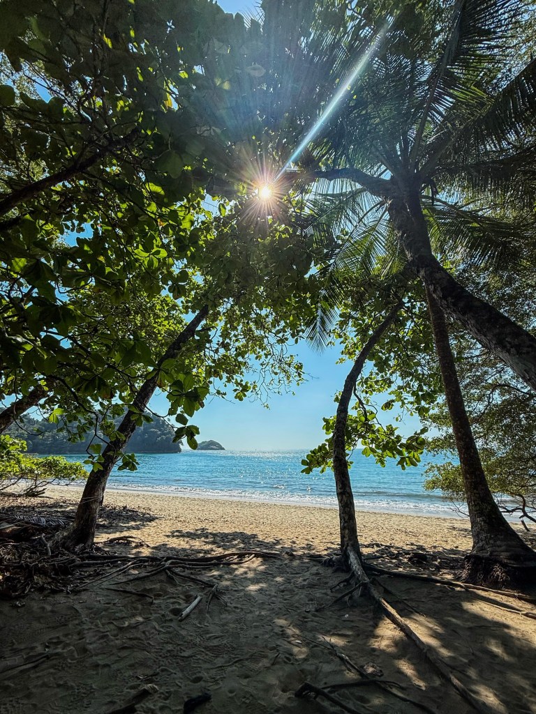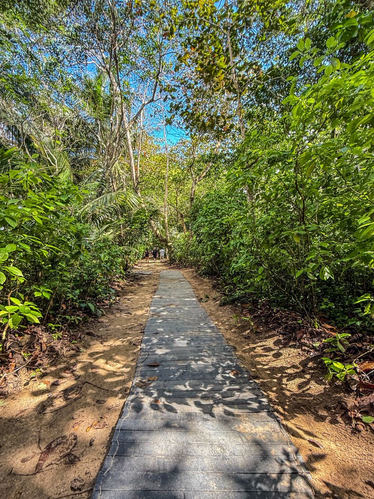 A kijelölt ösvény közvetlenül a part mellett halad, egyik oldalán a sűrű dzsungellel, másikon pedig fehér homokos stranddal. A víz türkiz színben ragyogott, a hullámok halk morajlása keveredett a fák között ugráló majmok hangjával. Az egyik ágon fekete-fehér arcú pókmajmot láttam, aki kíváncsian figyelte az érkezőket, mintha ő is turistáskodna.